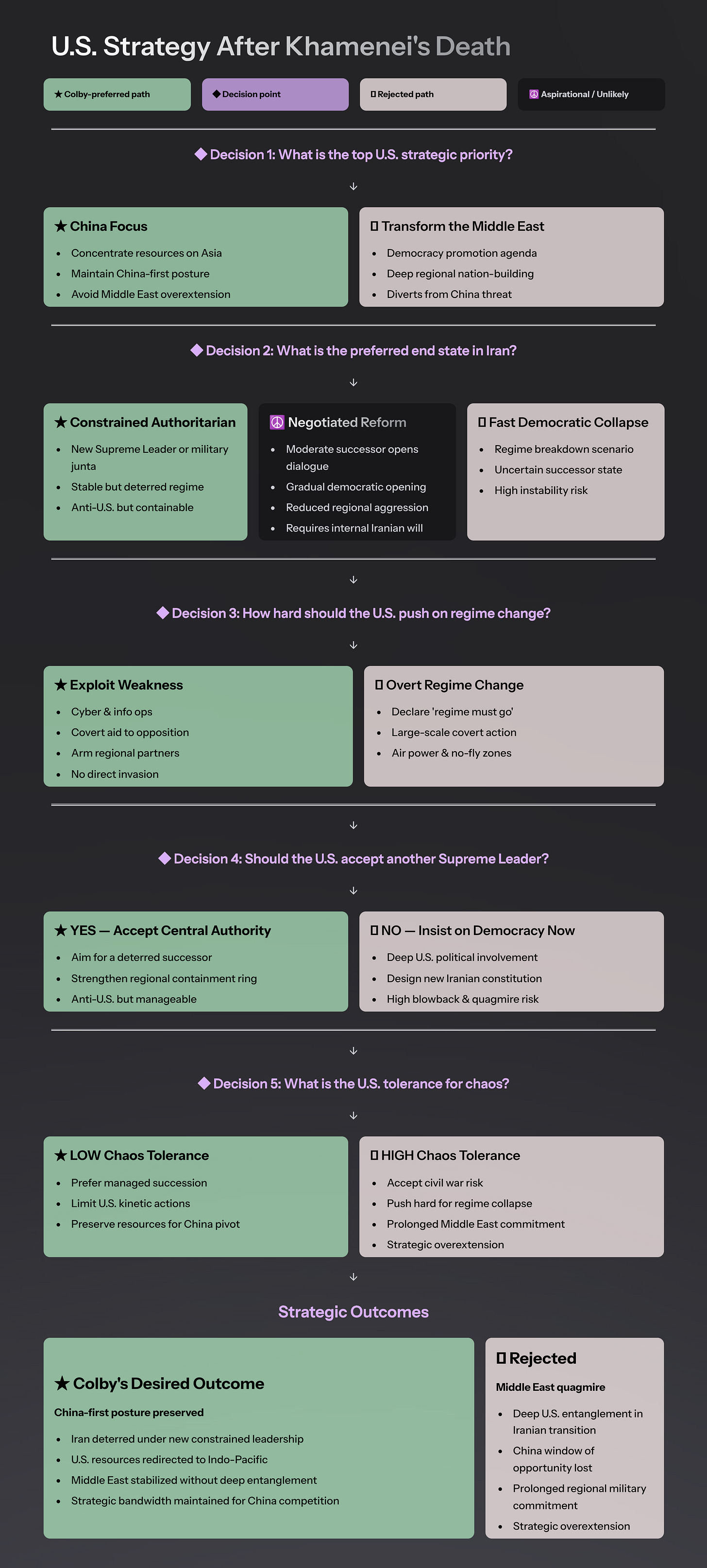 Elbridge Colby is the Architect of the War Department. He is third in the civilian hierarchy under Hegseth and Trump. It’s estimated that 80% of Iranians do not want a new Supreme Leader, however dissolving the Islamic Republic’s Assembly of Experts (the actual name 🙈) seems an unlikely near-term event.